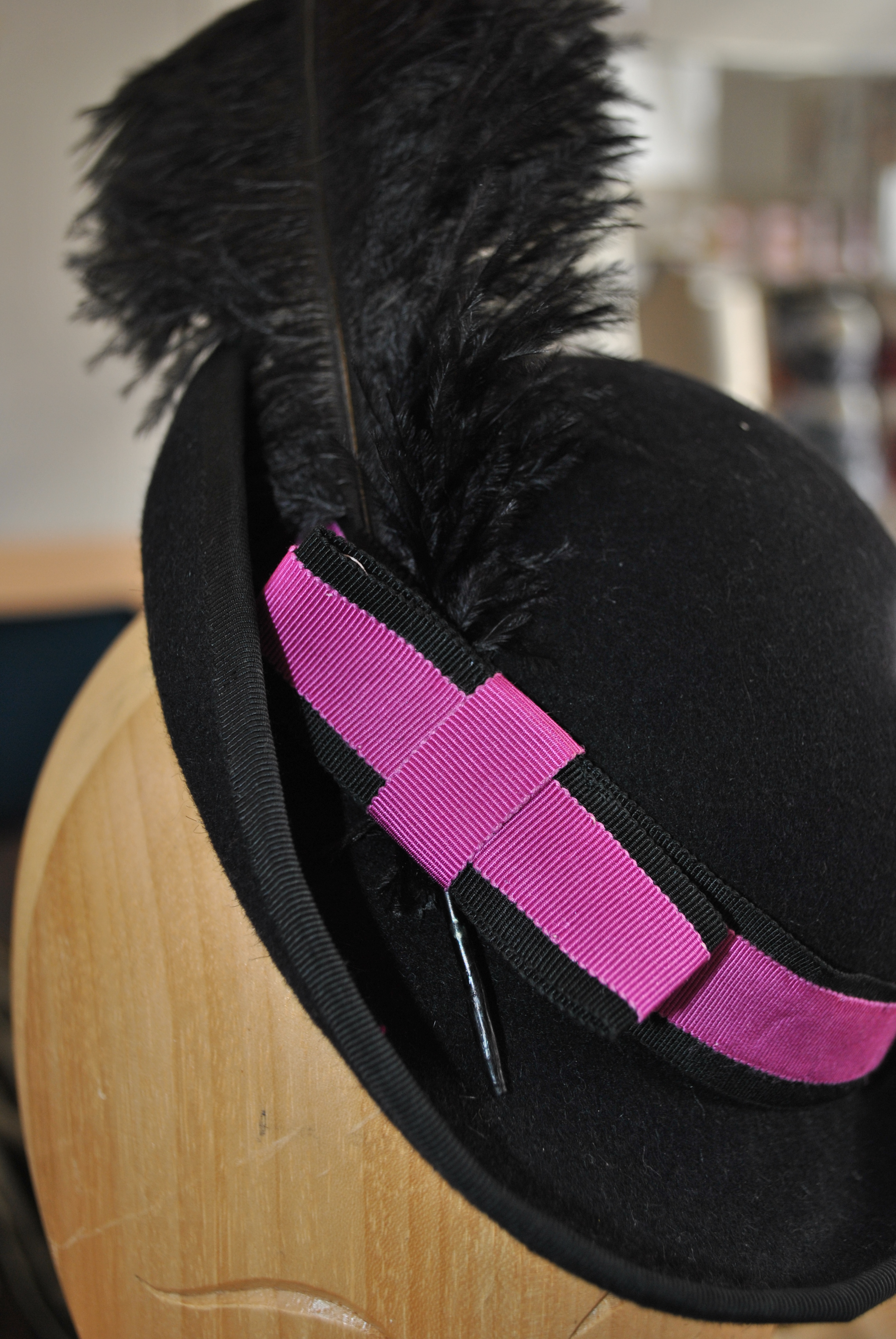 A cute felt percher bowler hat trimmed with petersham ribbons and a miniature prime ostrich plume.