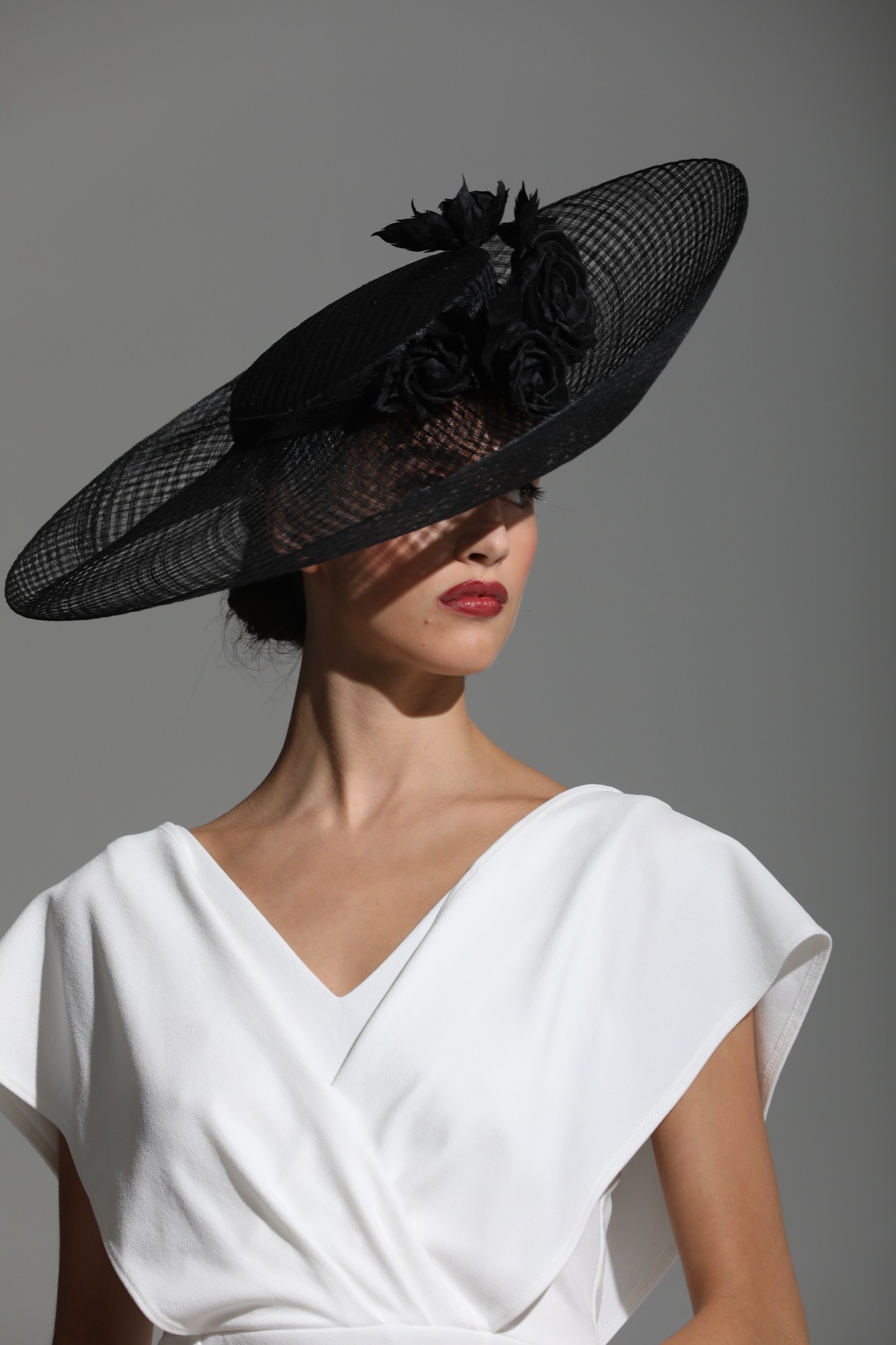 Black windowpane sinamay sidesweep brim hat with handcrafted silk roses