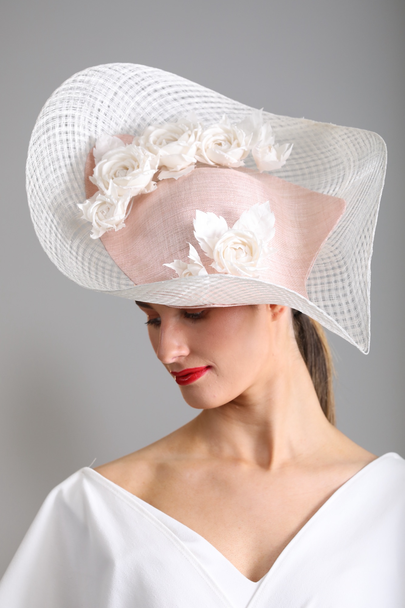 Windowpane sinamay edged curved saucer hat with handcrafted silk roses