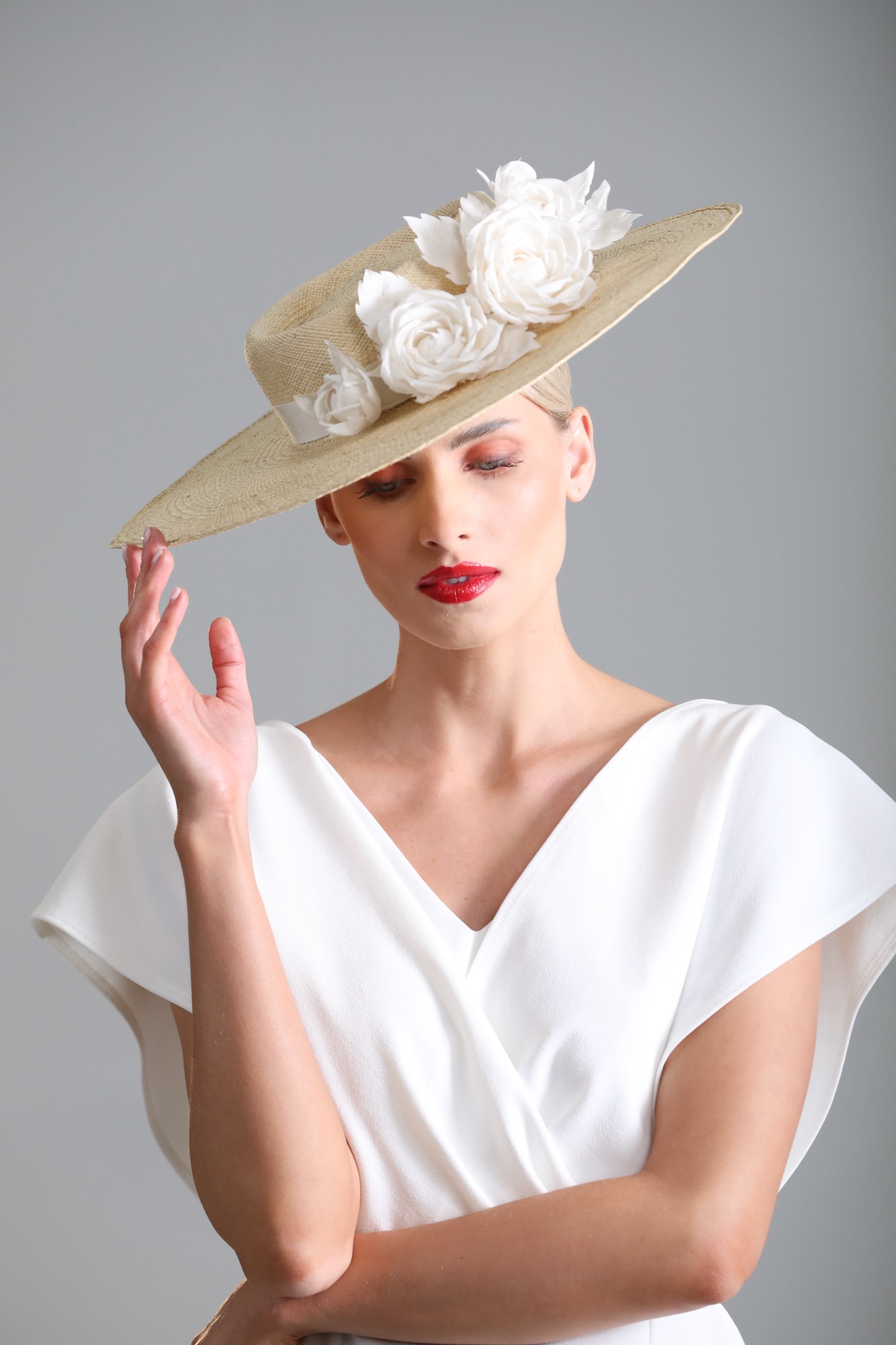 Natural Panama Straw hat with handcrafted ivory silk roses.